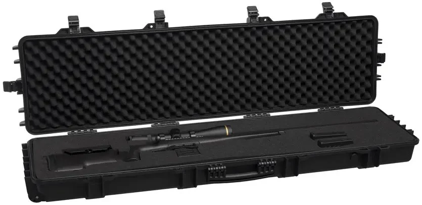 Heavy-duty travel case offers maximum protection for long guns. Tough reinforced polypropylene construction. Folding handles and wheels for easy transport. Pick and pluck foam padding.